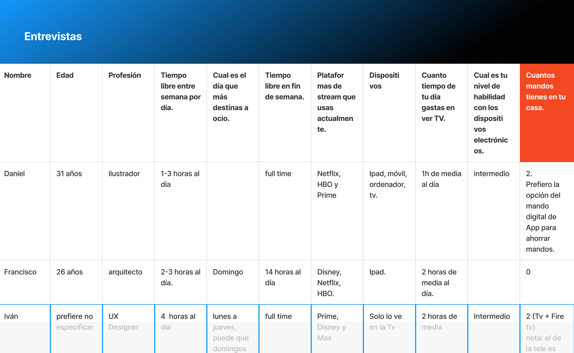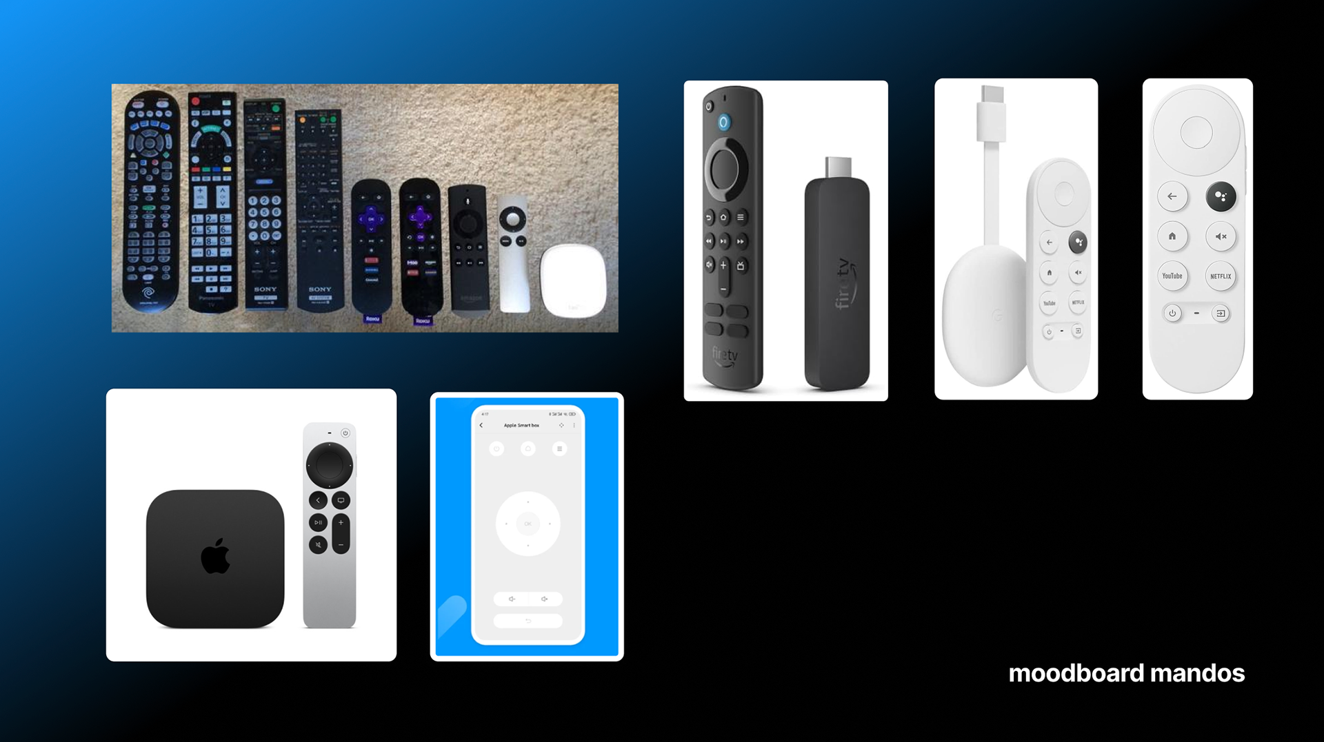 En esta fase, el Crazy 8, el moodboard y el storyboard fueron útiles para definir la arquitectura de la información del proyecto. Hicimos un moodboard concreto solamente de mandos, para tomar referencias de mandos "clásicos" con más botones, y las opciones más actuales con un diseño más minimalista. Nos sirvió para encontrar los "botones imprescindibles" y las opciones de interés para el mando avanzado.