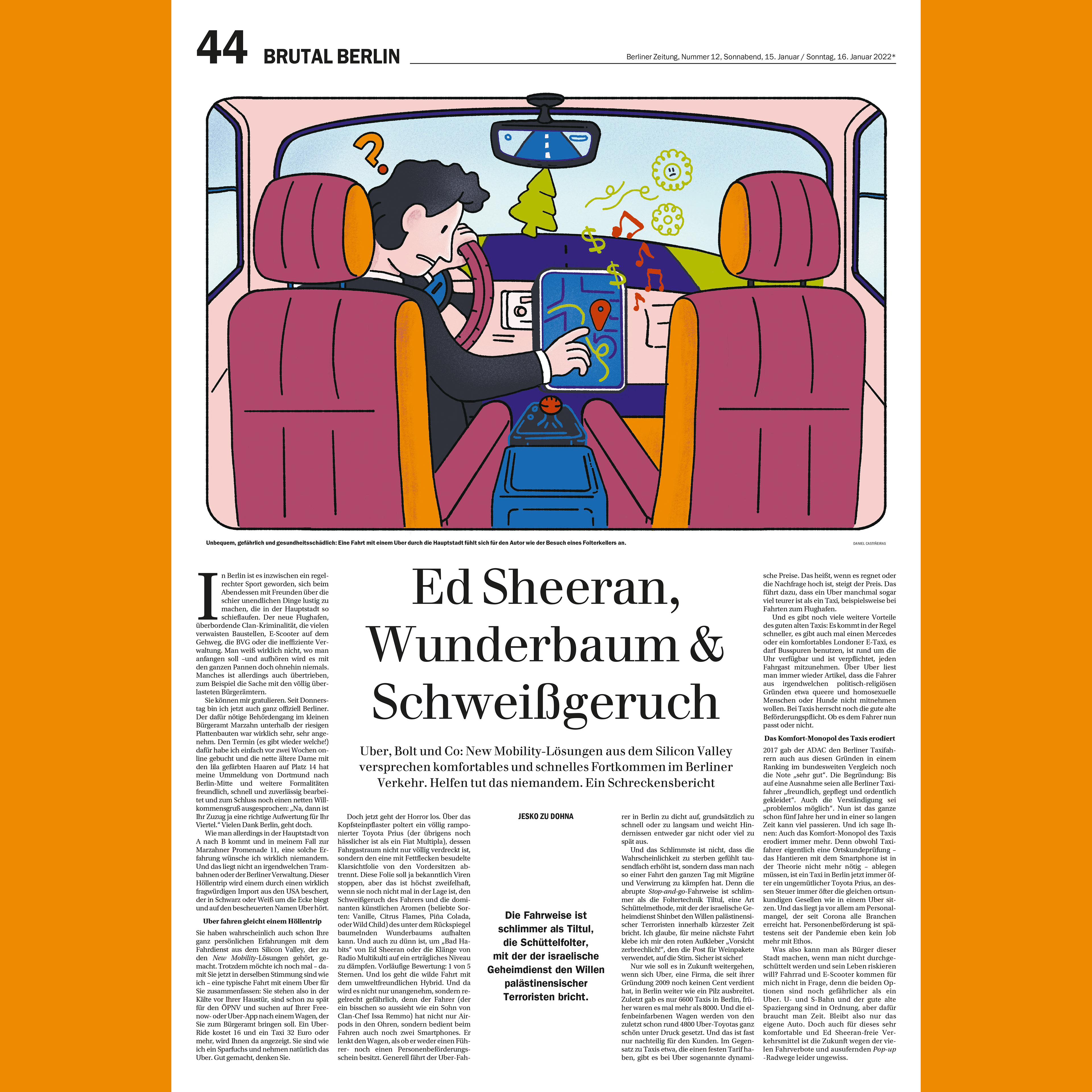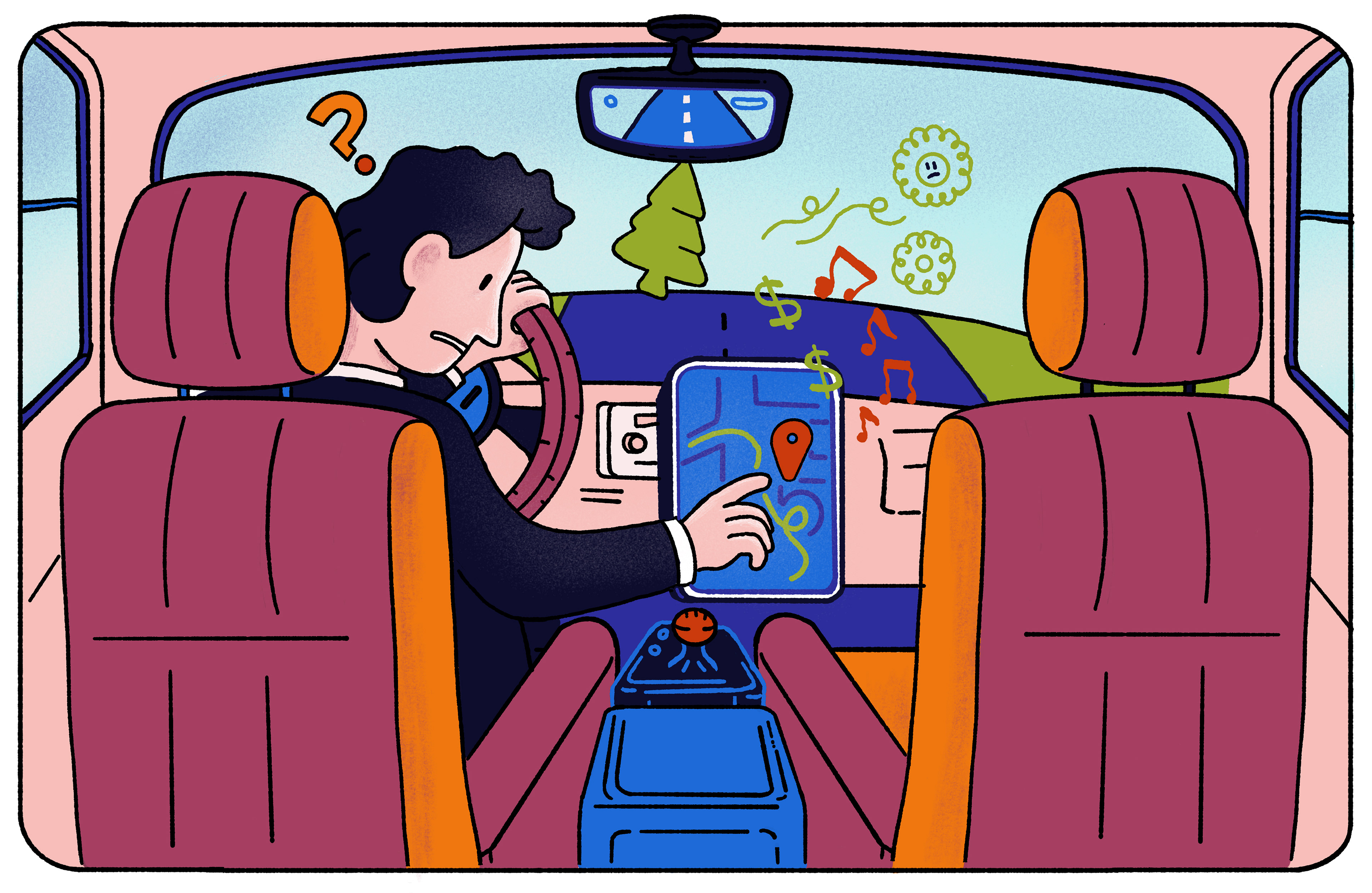Editorial illustration about bad experience with Uber, Bolt and Co. Illustration for Berliner Zeitung.